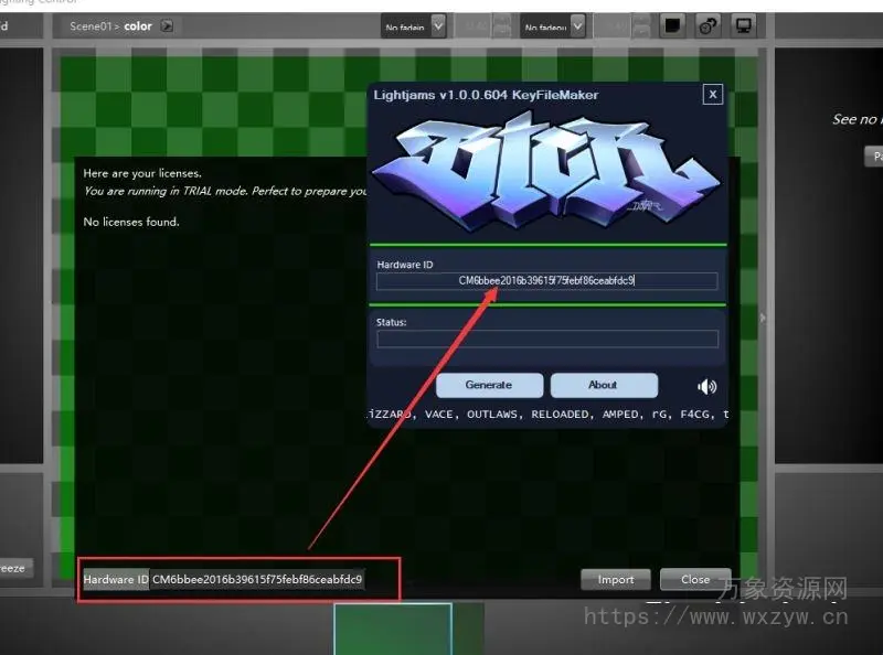 3.将许可证查看界面左下角的Hardware ID复制到注册机对应的Hardware ID一栏。如图