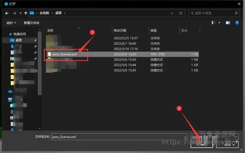6.找到桌面,选择jams_license.xml,最后点击打开,如图