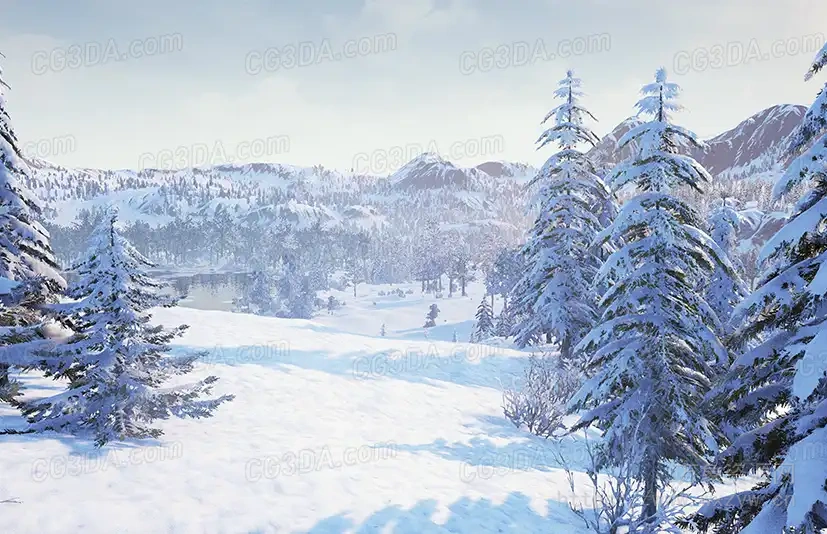 一组美丽且高品质的冬季植被。适合创作任何复杂度的景观。山脉、雪林、结冰湖泊等等。它包括用于生成物体雪的程序化着色器,以及用于景观的程序化着色器。