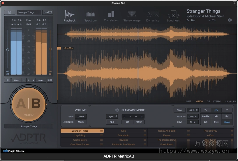 混音和母带制作所需的所有参考仪表。将 Metric AB 插入主通道,按键绑定“A/B”按钮,然后使用键盘在混音之间快速切换。