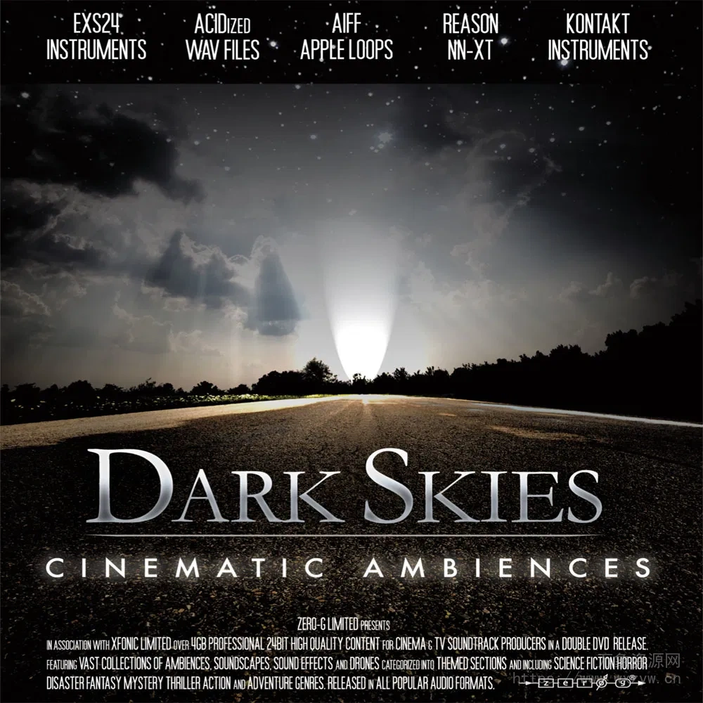 “Dark Skies: Cinematic Ambiences”是 Zero-G 最畅销的 DVD 作品之一。充满环境声、音景、无人机和 FX 的音乐,是任何专业电影、电视或视频游戏制作人和声音剪辑师的完美伴侣。